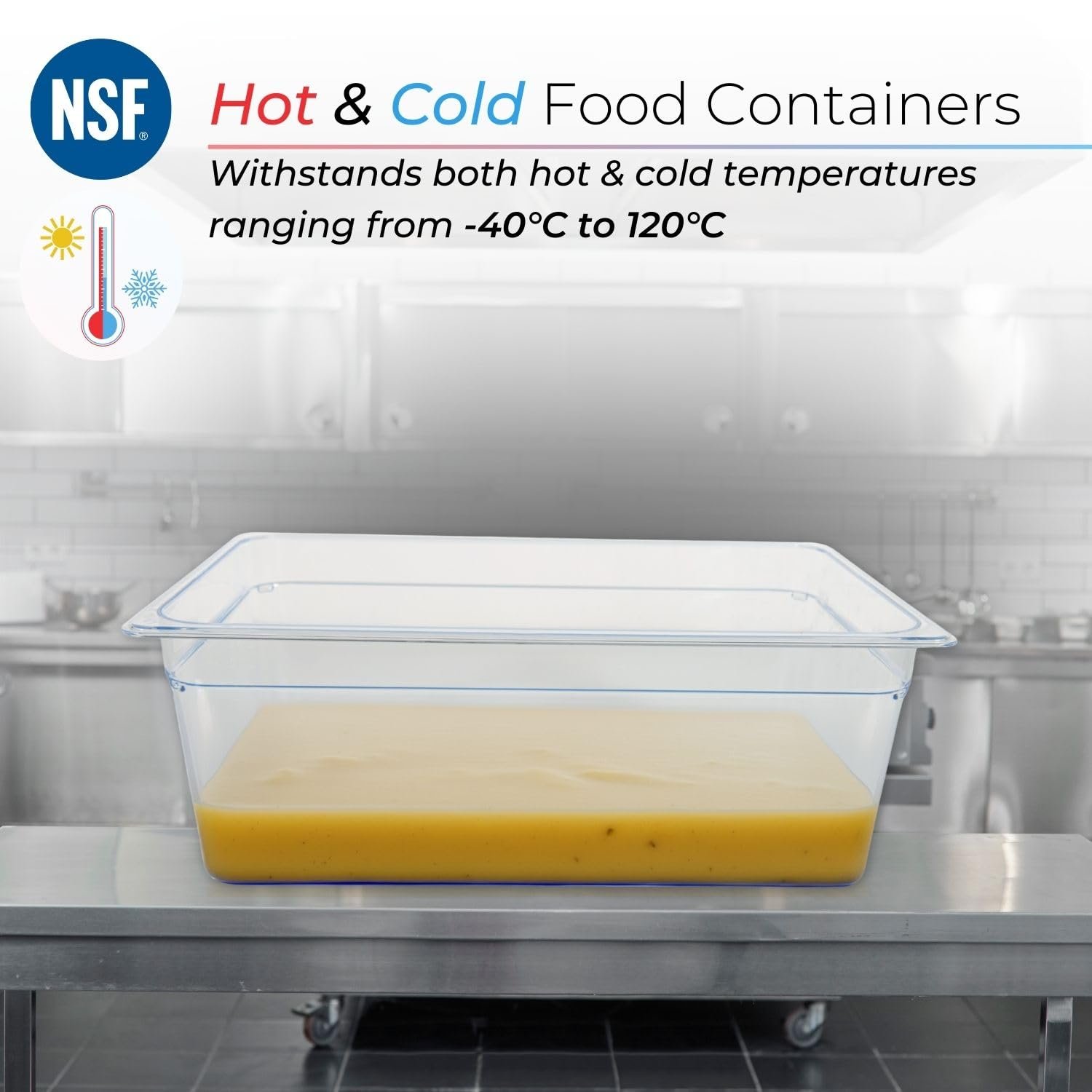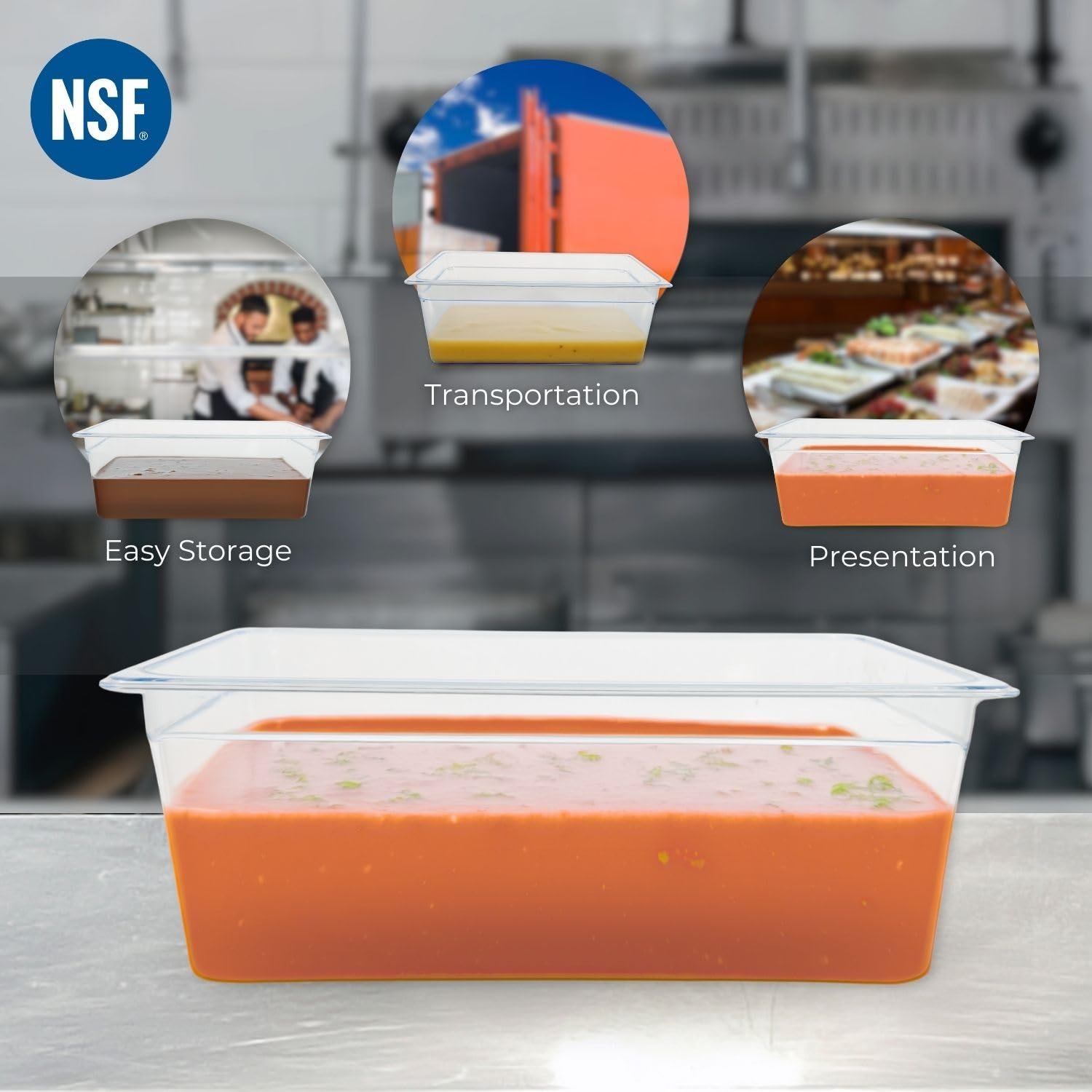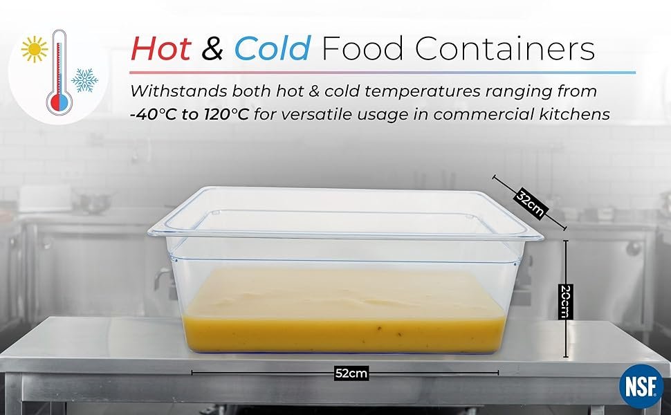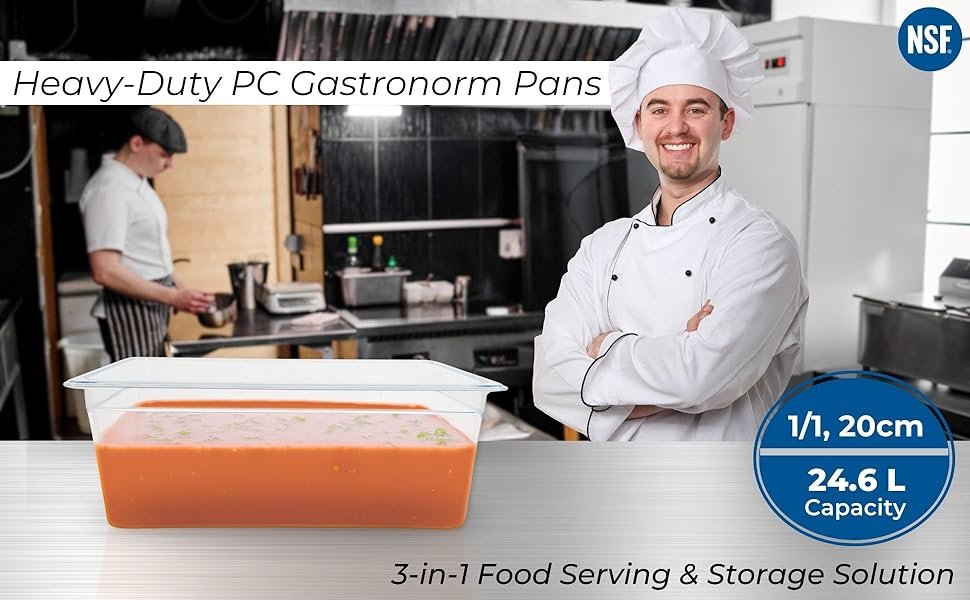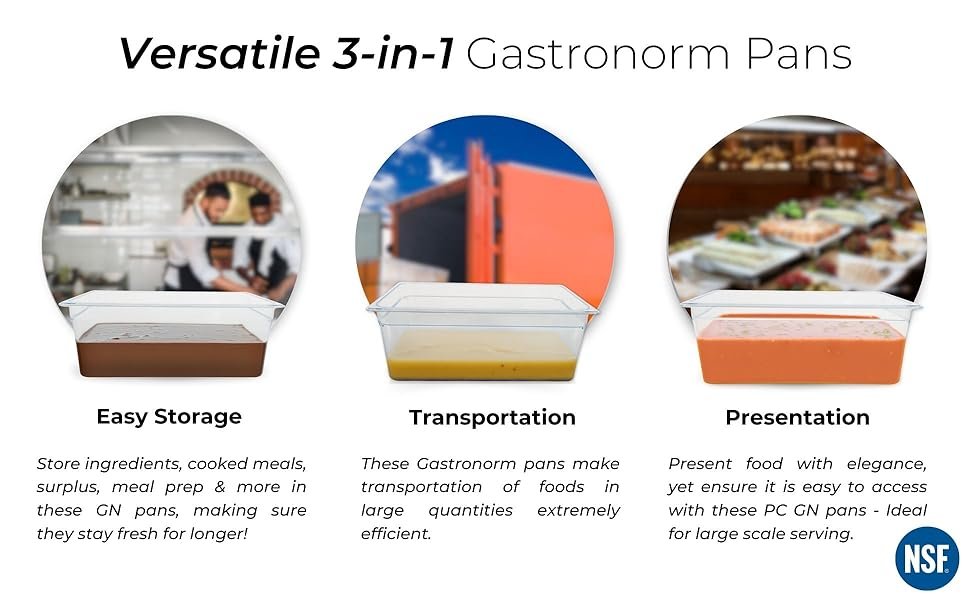 PC GN PAN (Gastronorm Pans) offer the perfect solution for seamless food storage, safe transportation, and elegant serving display. Designed to meet the demands of professional kitchens, they simplify operations with one versatile product. These PC Gastronorm Pans are NSF certified, meaning that they are rigorously tested to meet the highest quality and safety standards. Perfect for maintaining hygiene, they are food safe and provide peace of mind in any professional or commercial kitchen environment.